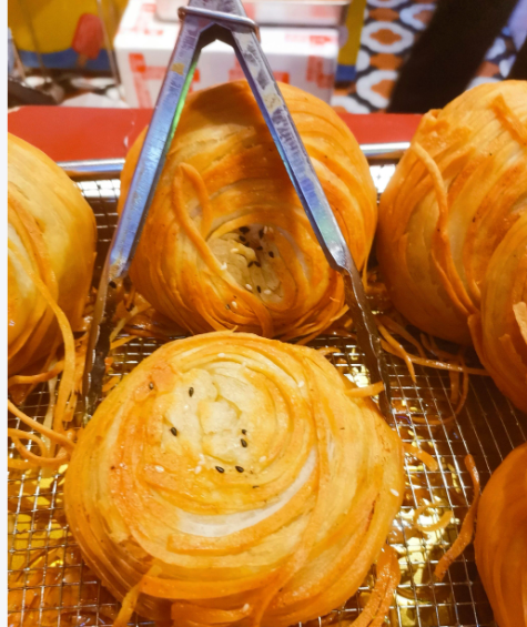 刚出炉的牛肉饼外皮金黄酥脆到掉渣,内馅采用前腿牛肉,粗剁工艺保留了肉质的颗粒感。咬开的瞬间,滚烫的牛肉馅爆出,混合着孜然与辣椒粉的香气,咸香中透出恰到好处的微辣。