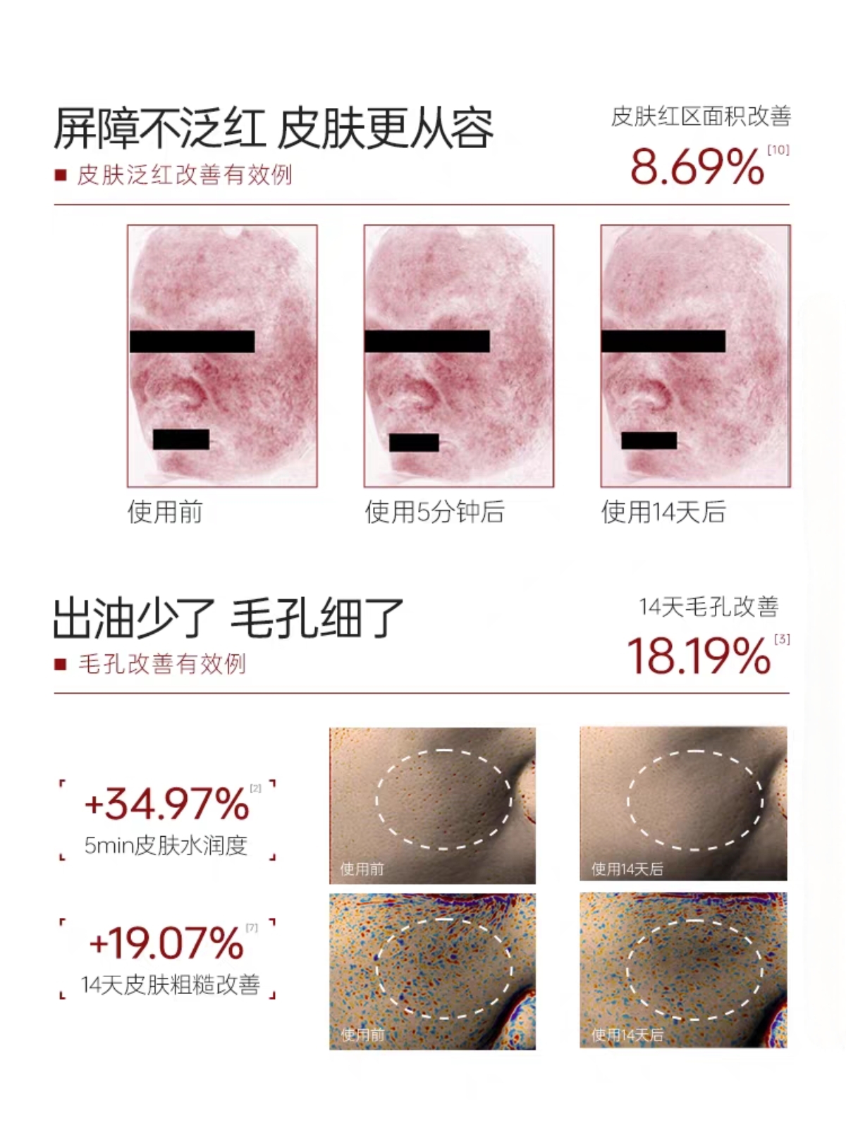 屏障修护:清洁后不破坏肌肤皮脂膜,即时提升肌肤含水量24%,连续使用28天可降低经表皮水分流失值25%,缓解换季泛红、干痒、紧绷等不适,修护受损肌肤,强化肌肤屏障,让脆弱肌、受损肌逐步恢复稳定状态,长期使用可提升肌肤自身修护力。