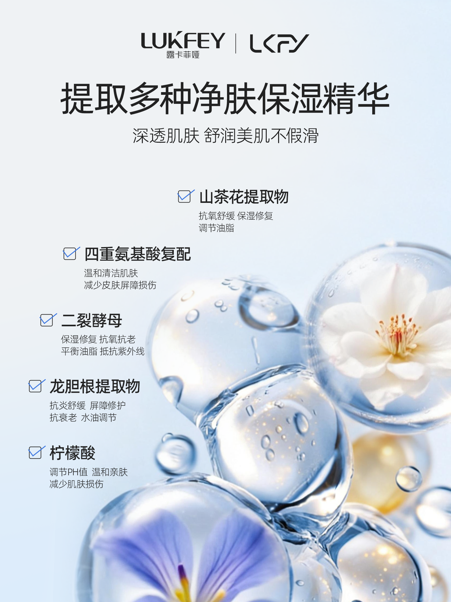 油皮/混油皮:水油调节功效出色,能有效抑制油脂分泌,维持长效清爽,改善T区出油泛滥问题,适合日常及运动后清洁,避免油脂堆积。